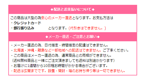 北海道・沖縄・離島配送できません。※メーカー直送の為、日付指定・時間指定の配達、通常商品との同梱ができません。(送料無料商品と一緒にご注文頂きましても送料は別途かかります)お支払方法はクレジット・銀行振り込みです。(代引不可)北海道・沖縄・離島など一部地域への配送はできません。1週間から10日程お時間がかかる場合がございます。配送は玄関までです。設置・開封・箱のお持ち帰り等は一切できません。