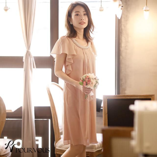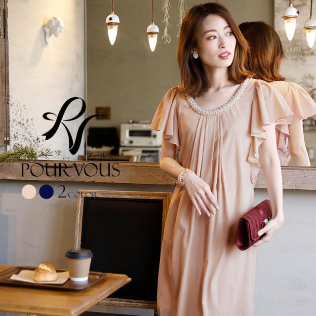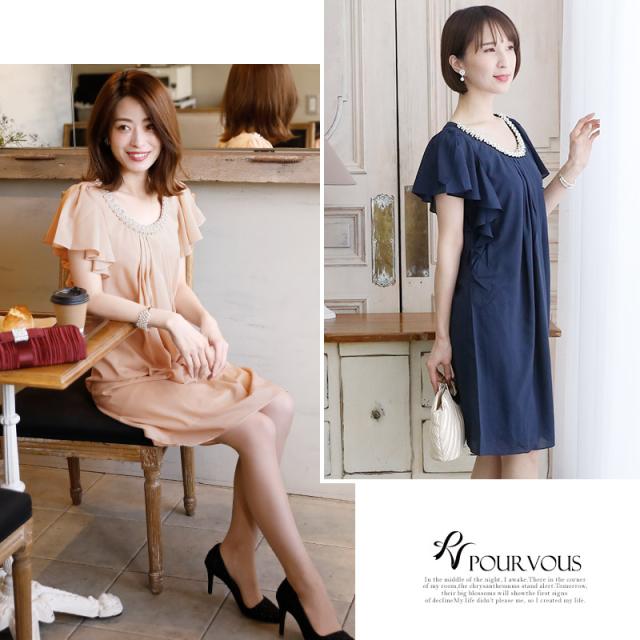 ビジュー付き 袖フリル ギャザーAラインドレス 【1757】ドレスワンピ・服装・ワンピース・フォーマルワンピ・ドレスカジュアル・ブランド・半袖・袖あり・ショート・ミニ・膝丈・無地・花柄・脚長効果・伸縮性・キレイめ・着やせ・ドレープ・ビジュー・フレア・ベージュ・ネイビー・袖フリル・体型カバー・セット・スタイルアップ・レース・小さいサイズ・3Lや4L・かっこいい、かわいい・即日発送・送料無料・結婚式・婚活・披露宴・顔合わせ・発表会・演奏会・二次会・同窓会・お呼ばれ・食事会・謝恩会・親族・七五三・お宮参り・冠婚葬祭・弔事・女子会・韓国・デート・入学式・卒業式・入園式・卒園式・ママ・ピアノ・マタニティー・セレモニー・セレブ・パーティー