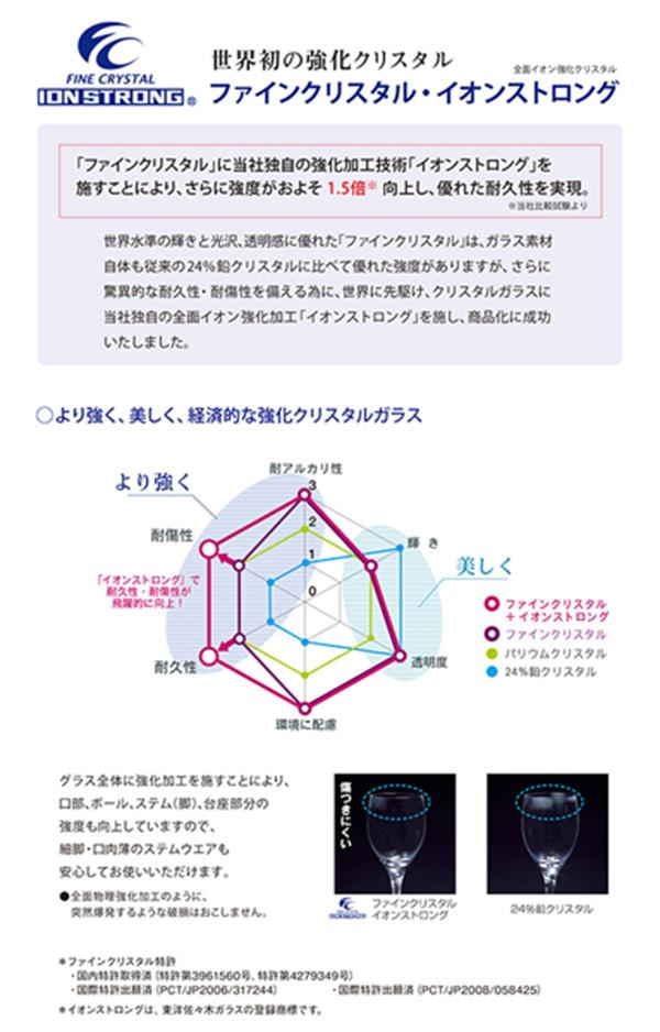 ●傷つきにくい優れた強度をもつ「ファインクリスタル」に、さらに強化加工「イオンストロング」をグラス全体に施しているので、強度耐久性がおよそ1.5倍と高くなっています。