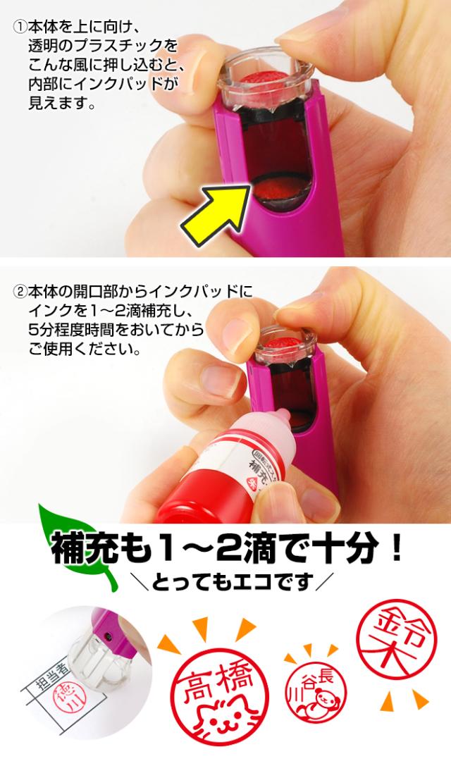 - 液漏れもなく無事に届き、注入もしやすかったです。1回分の補充は少量なので1本買えば長持ちすると思います。染み込みもよく発色も元通りで綺麗に押印できました。