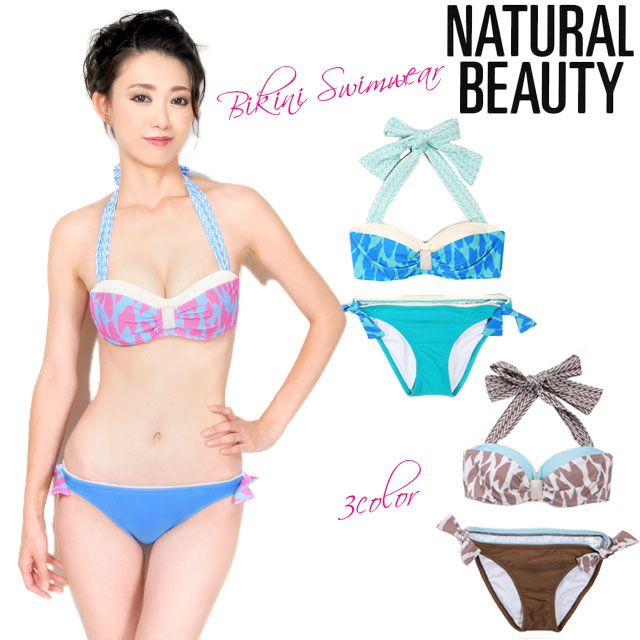 NATURAL BEAUTY(ナチュラルビューティ)のブランド水着。ワイルドなレオパード柄が大人っぽいバンドゥビキニです。真ん中の宝石のようなチャームもゴージャスな雰囲気!ヘリンボーン柄の首リボンは取り外すことも出来るので、気分によってスタイルチェンジを楽しめます。取り外せる盛りパッド付きだからバストアップ効果もGOOD!