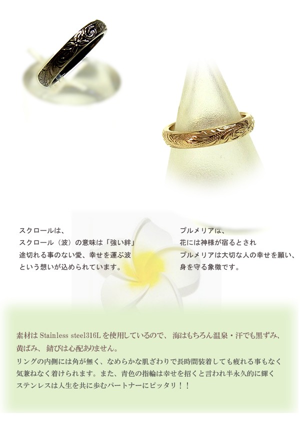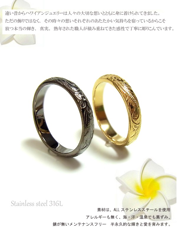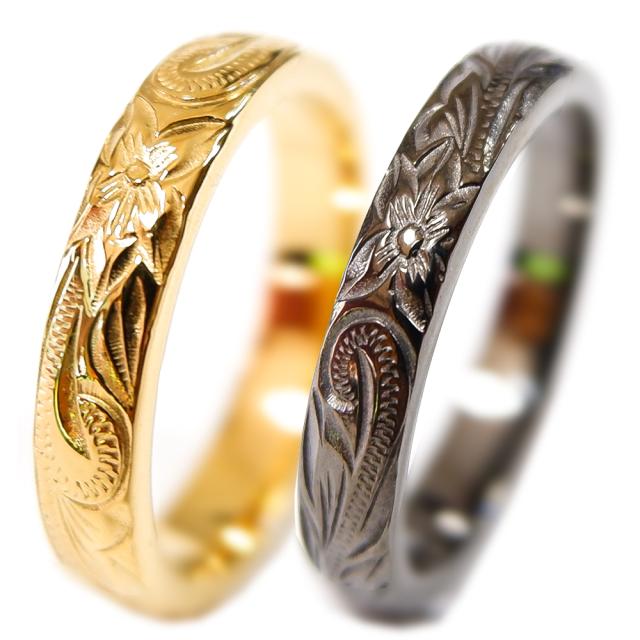 送料無料 刻印無料 ペアハワイアンジュエリー ペアリング 指輪 ブラック イエローゴールド ステンレス BOX付き ラッピング対応 アレルギー対応