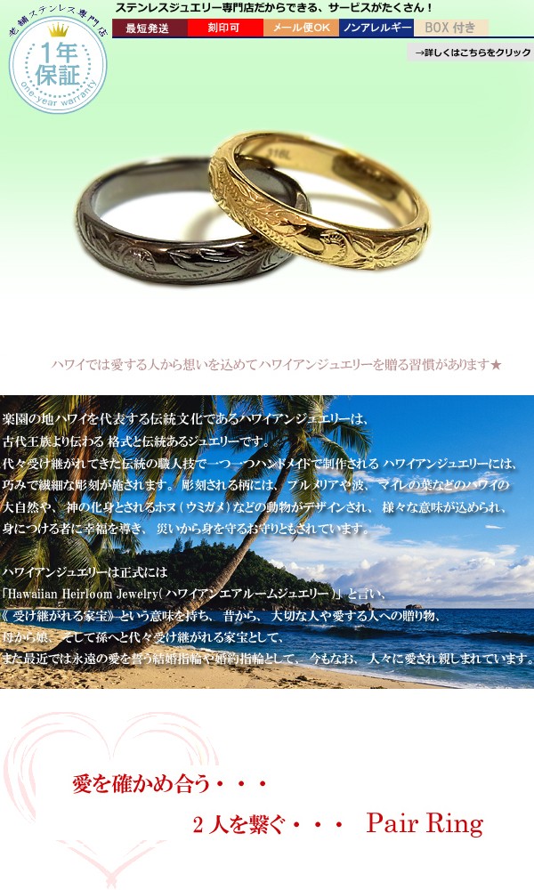 愛を確かめ合う・・・ 2人を繋ぐ・・・ Pair Ringハワイでは愛する人から想いを込めてハワイアンジュエリーを贈る習慣があります★ただの飾りではなく、その時々の想いそれぞれのあたたかい気持ちを宿っているからこそ放つ本当の輝き、真実。熟年された職人が積み重ねてきた感性で丁寧に彫りこんでいます。