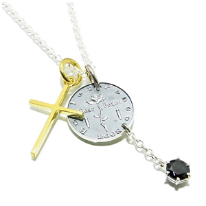 真鍮製のクロスといぶし加工されたコインがセットになったペンダントトップです。コインには一輪のバラと弾丸が浮き彫りにされ、その下にチェーンでつながれたブラックジルコニアが揺れるデザインになっています。