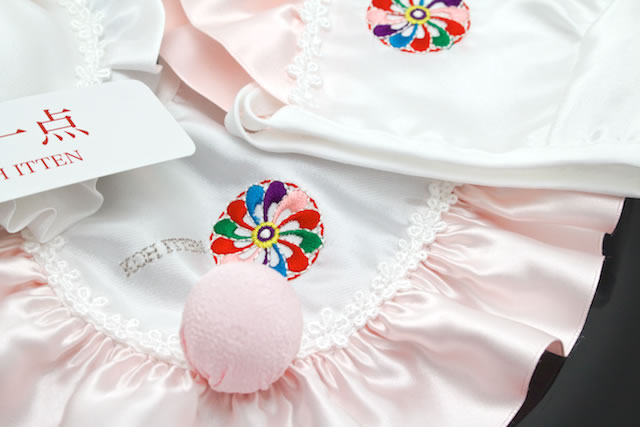 女児用として、ピンク色のフリルと花の刺繍を施しました。