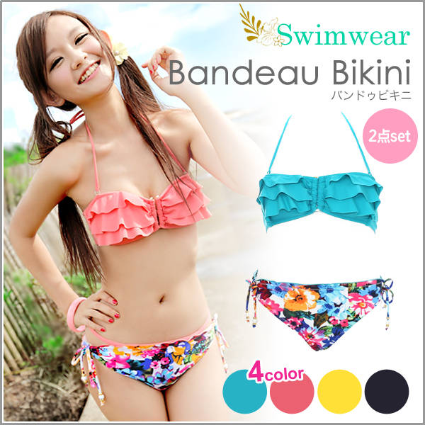 水着 バンドゥ ビキニ レディース 花柄 2点 セット セパレート フリル ショーツ swimwear ホルターネック リゾート[送料無料]