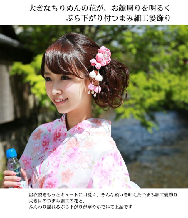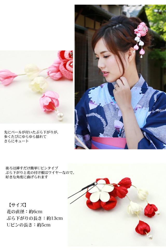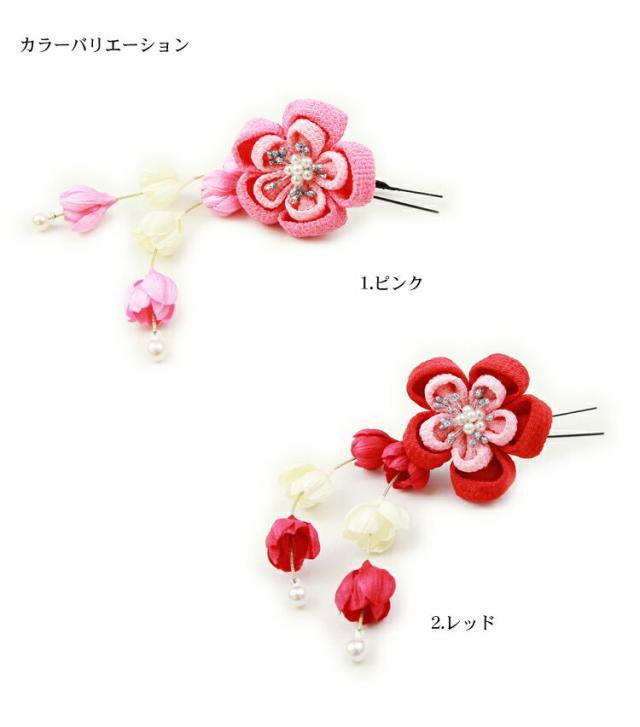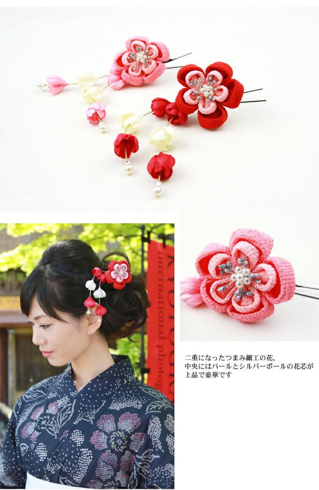 髪飾り 浴衣「ぶら下がり付八重梅つまみ細工髪飾り」赤・ピンク Uピンかんざし ヘアアクセサリー 簪 ちりめん細工 和柄