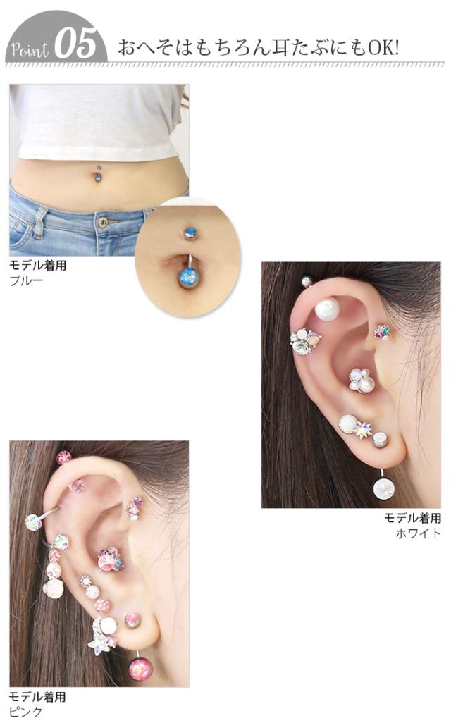 - こちらのヘソピアス、耳用に購入しました。画像の通り可愛いいです。色違いも欲しくなりました。