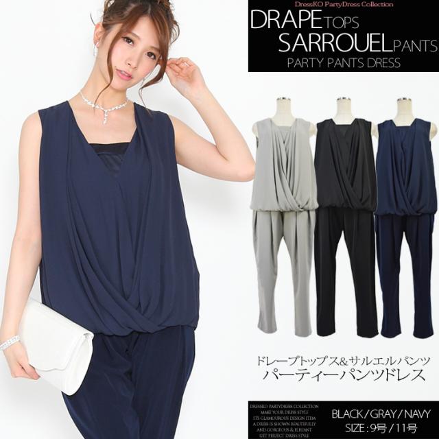 パンツドレス 結婚式 大きいサイズ セットアップ ノースリーブ ドレープデザイントップス サルエルパンツドレス パーティードレス セットアップ 結婚式 パンツスタイル サイズ9号 11号 発表会 2次会 披露宴 入園式 卒園式 入学式 卒業式