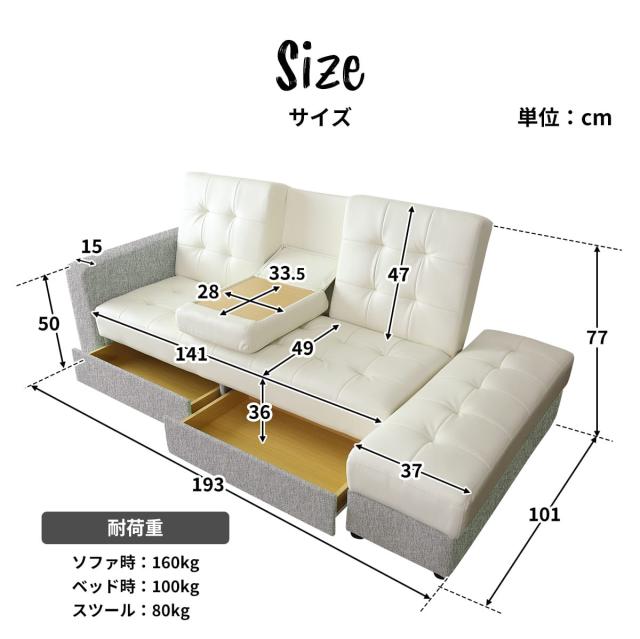 【本体】約幅193×奥行49〜101×高さ77 座面高:36(cm)