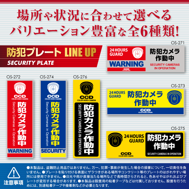 防犯プレート「OS-274」は、「防犯カメラ作動中」と大きく記載のある丈夫なPP製プレートの縦タイプ防犯プレートです。