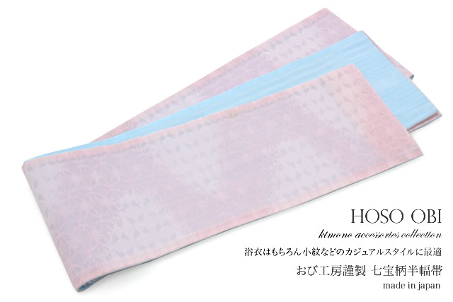 浴衣 帯 半幅帯 リバーシブル おび工房 桐生織 桜色 ベビーピンク 七宝柄 夏 夏着物 細帯 半巾帯 日本製