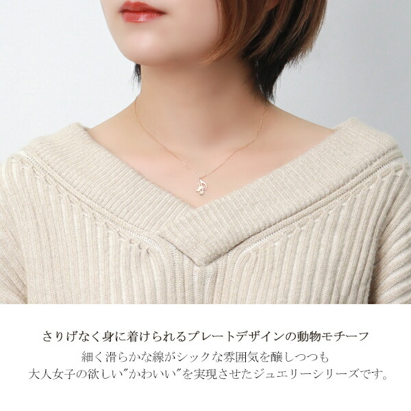 幼くなりがちなアニマルモチーフも、フラットなプレート状にすることですっきりとした大人なデザインになり、華奢な大きさなので年代を問わず、着け心地も軽やか。