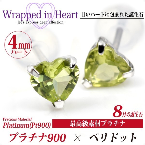 ペリドット ピアス 送料無料 Pt900プラチナ 4mm ハートシェイプ ラップドin スタッド 両耳ペア