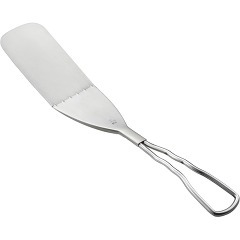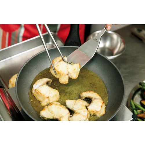 ●食材を返すだけではなく、身が縮んで反りかえりやすい食材(肉や魚)を押さえるのにも便利なターナー