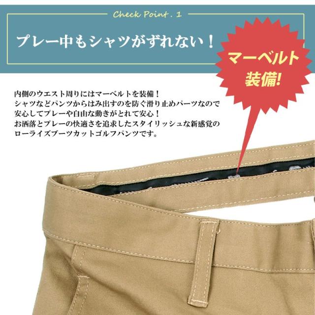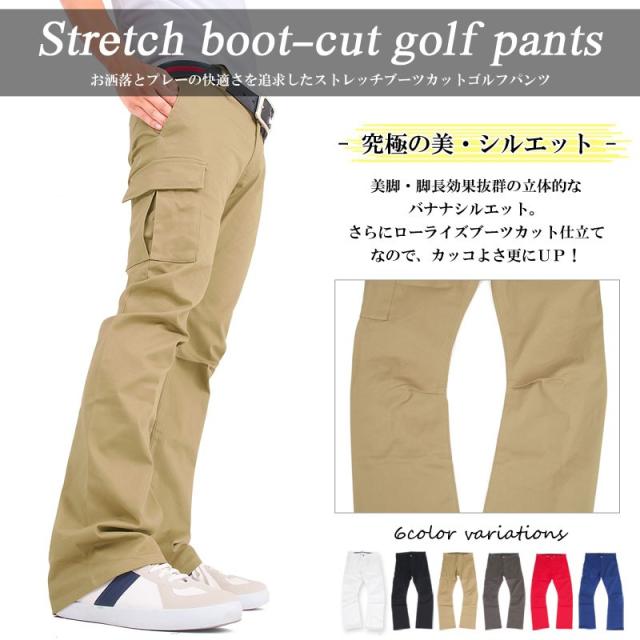 究極の美・シルエットと履き心地!美脚・脚長効果抜群の立体的なバナナシルエットで快適な履き心地が楽しめるストレッチ素材のローライズブーツカットゴルフパンツ!