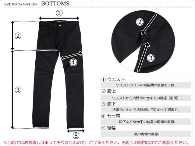 | 目安サイズ | (1)ウエスト | (2)股 上 | (3)股 下 | (4)モモ幅 | (5)裾 幅 |