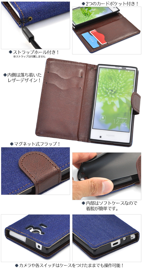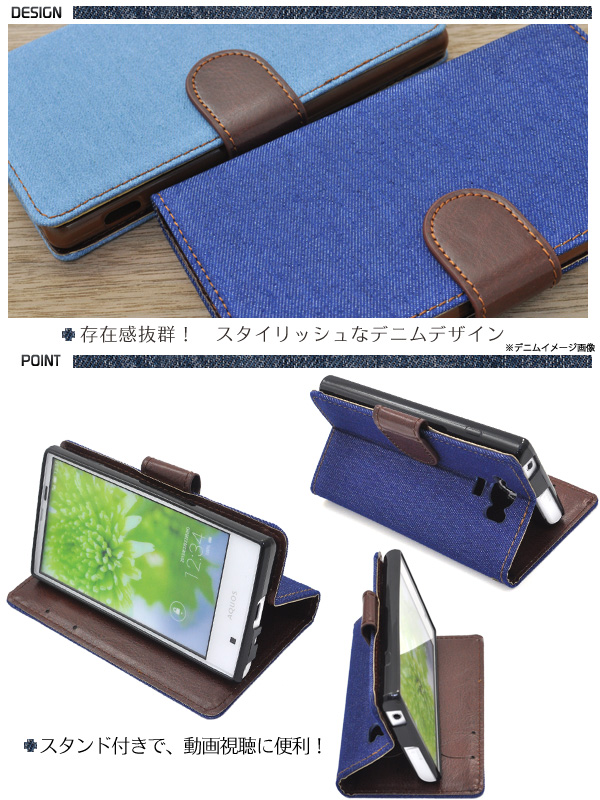 デニムデザインのAQUOS SERIE mini SHV31用スタンドケースポーチ。 衝撃やキズなどからAQUOS SERIE mini SHV31を守ります。 内部ケースはソフトケースなので、着脱が簡単です。 背面を折り返すとスタンドとして使用できるので、動画視聴に便利です。 便利なストラップホール付きです。 横開きタイプなので、手帳のように使うことができます。 また、内側に2つのカードポケット付きです。※ケースをつけたまま撮影できますが、フラッシュ撮影時にケースの色が移り込むことがあります。■配送方法■メール便で発送します。ご注文前に必ず「メール便注意事項」のページをご確認下さい。