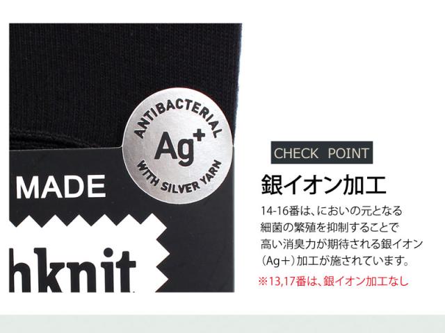14-16番は、においの元となる細菌の繁殖を抑制することで高い消臭力が期待される銀イオン(Ag+)加工が施されています。 ※製造工程の過程による、小さなほつれ、微小な縫製のずれなどの返品対応は致しかねます。ご了承ください。