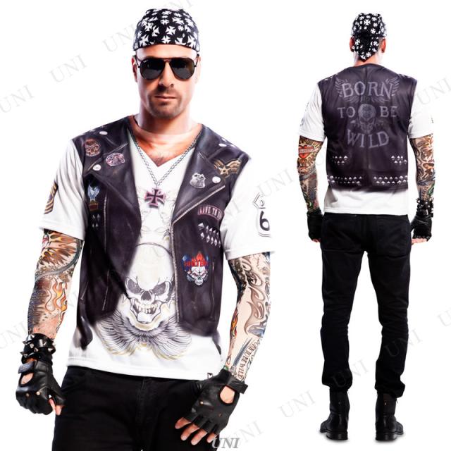 | 商品説明 | アメリカンなバイカー風のコスチュームTシャツと本物のようなタトゥが描かれたアームカバーのセットです。ベストとシャツを重ね着しているように見えるリアルなデザイン!お手持ちのパンツやサングラスと合わせてワイルドに着こなしましょう |