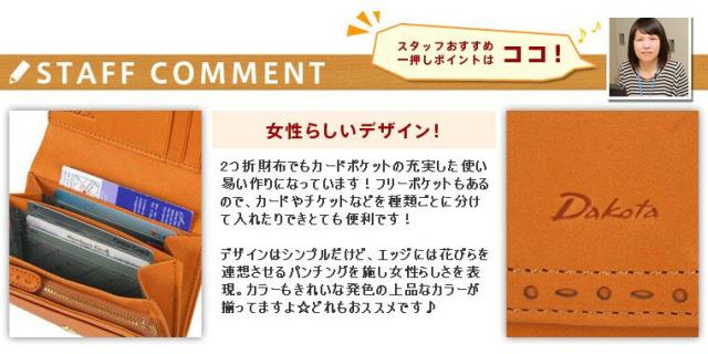 | ダコタ Dakota!二つ折り財布【アペーゴ】35270 しっとりと手になじむソフトなタッチ感の牛革を使用した【アペーゴ】シリーズの登場です。 カラーも温もりのある優しい色合いで表現しました。 エッジ部分に花びらを連想させるパンチングをほどこした女性らしいデザインのシリーズです。 |