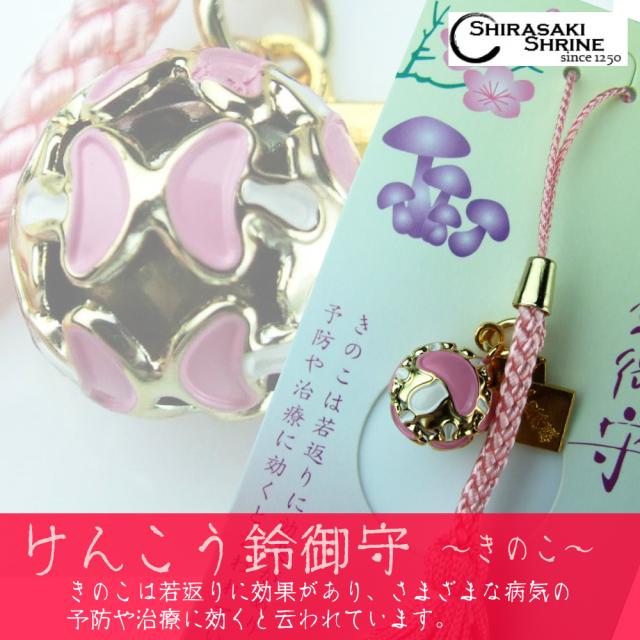 心身健康/開運招福 けんこう鈴御守【きのこ】ピンクのストラップタイプ 房付き 神社で祈願・祓い清め済み