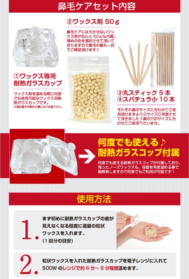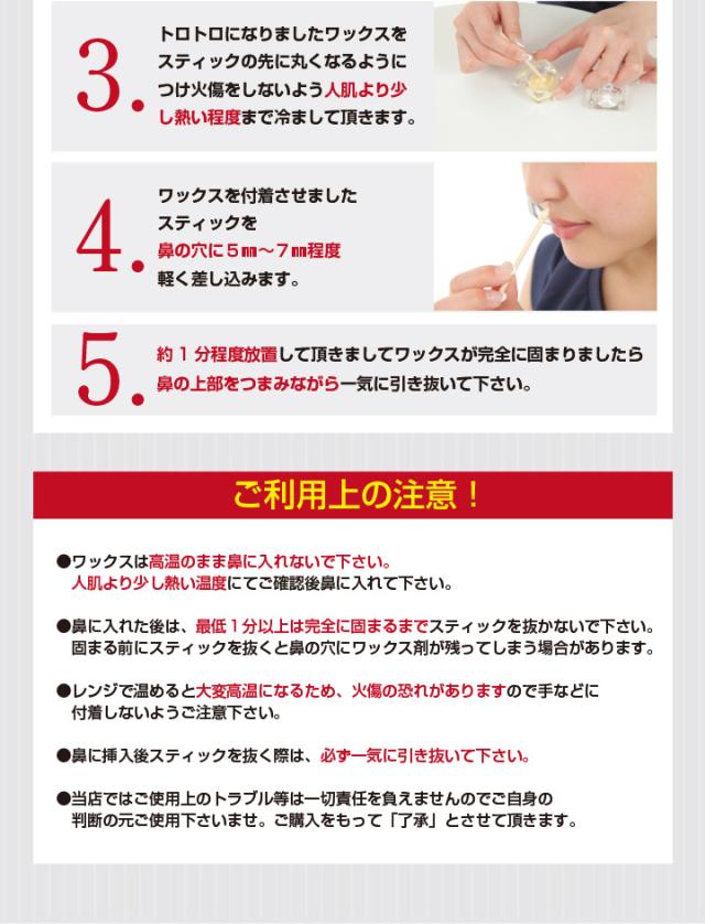 | ご注意 | ●ワックスは高温のまま鼻に入れないで下さい。 人肌より少し熱い温度にてご確認後鼻に入れて下さい。 ●鼻に入れた後は、最低1分以上は完全に固まるまでスティックを抜かないで下さい。 固まる前にスティックを抜くと鼻の穴にワックス剤が残ってしまう場合があります。 ●レンジで温めると大変高温になるため、火傷の恐れがありますので手などに 付着しないようご注意下さい。 ●鼻に挿入後スティックを抜く際は、必ず一気に引き抜いて下さい。 ●当店ではご使用上のトラブル等は一切責任を負えませんのでご自身の 判断の元ご使用下さいませ。ご購入をもって「了承」とさせて頂きます。 |