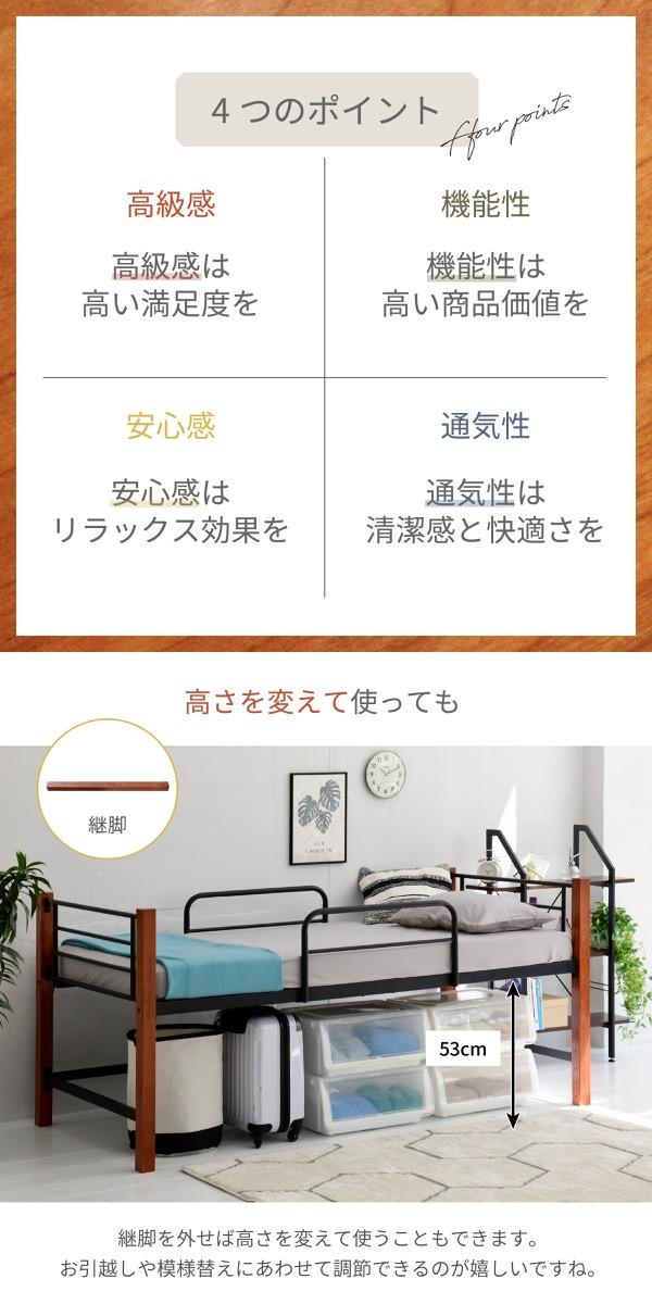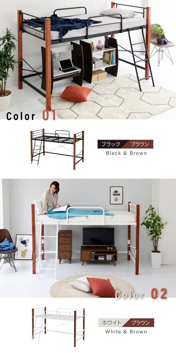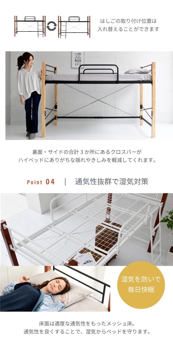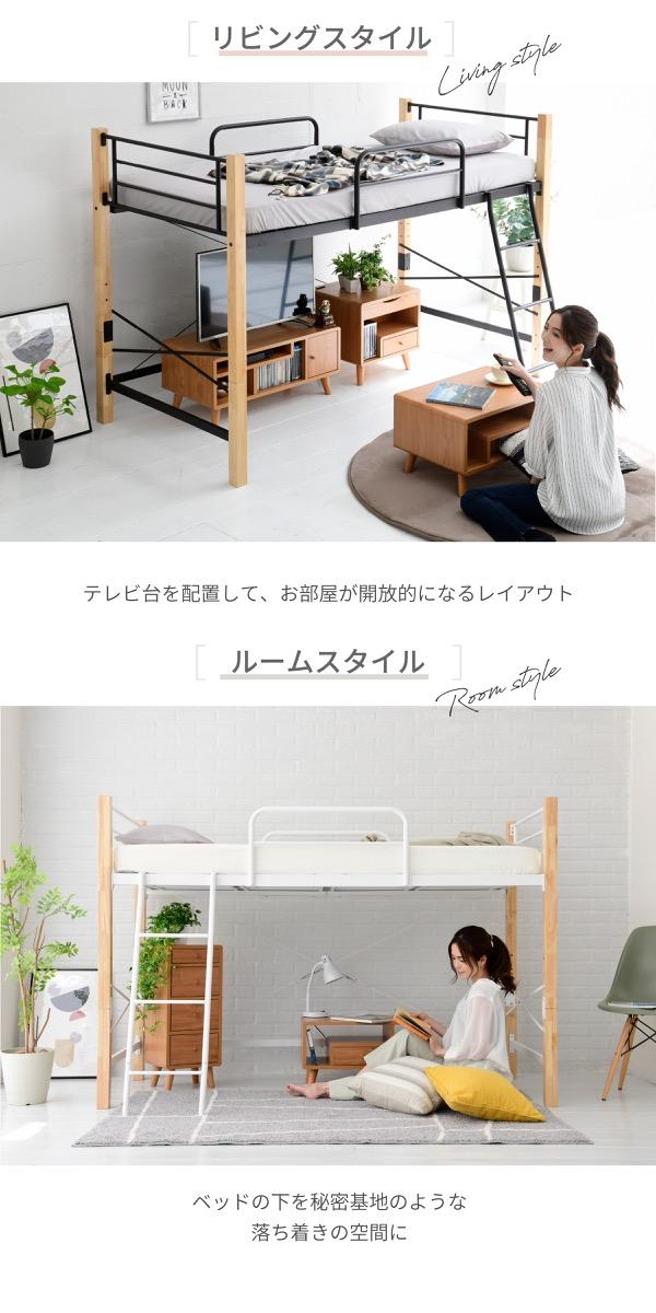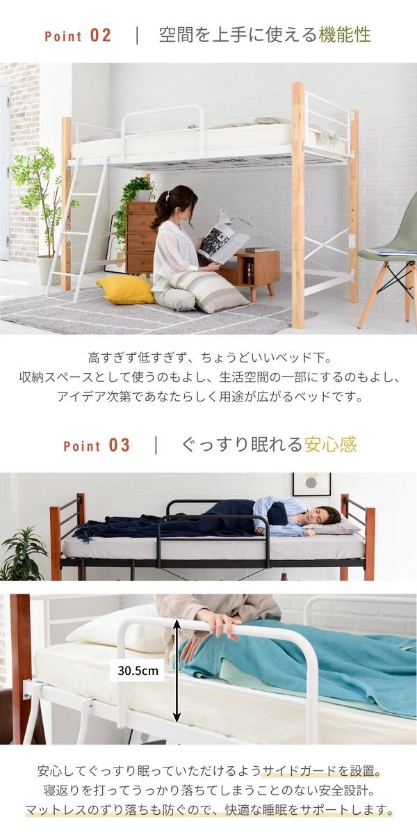 天然木脚 ハイベッド シングル パイプベッド ロフト 高さ 140 長さ 209 木製 ロフトベッド ロータイプ 天然木 頑丈 丈夫 新生活