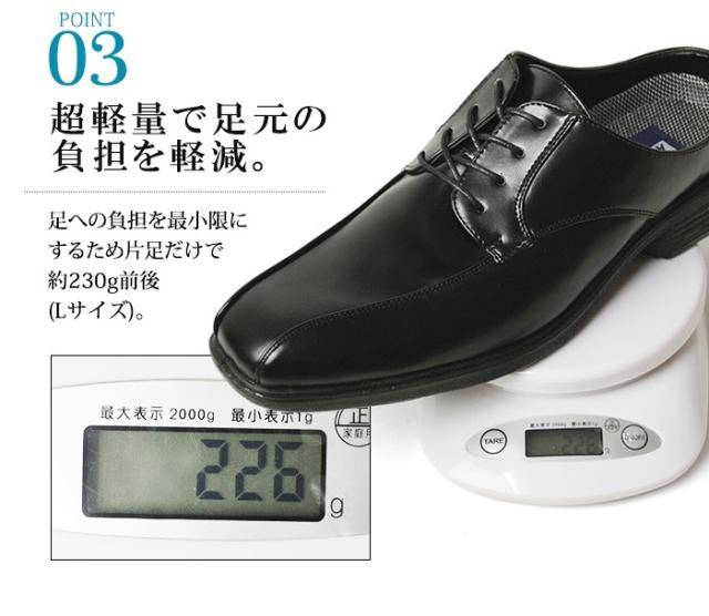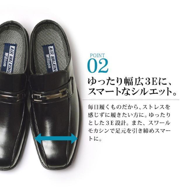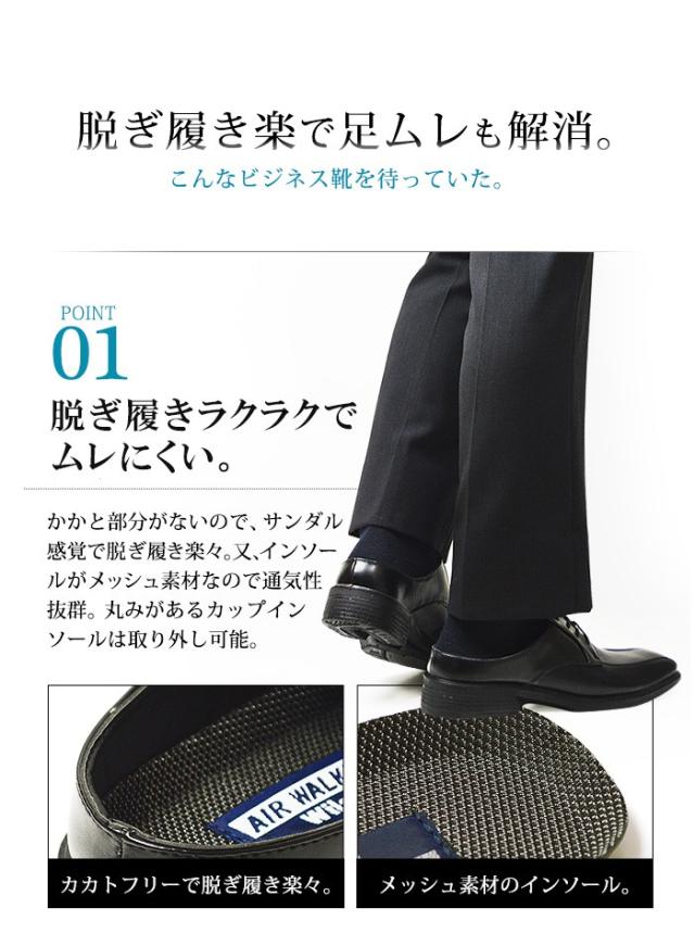オフィスや室内での勤務の方必見!脱ぎ履きラクラク。涼しく快適に過ごしたいならこのビジネスサンダルがおすすめ。カカト部分がないためサンダル感覚でサッと脱ぎ履きができ、取り外し可能のインソールがメッシュ素材で通気性もが良いなので長時間履いていてもムレにくくなっています。 さらに片足約230gの軽量設計なので足への負担を軽減!3E相当の幅広設計でゆったりと楽な使用感で窮屈さを感じません。ソールは優れた防滑効果を発揮し、濡れた路面でも安心して歩けます。クールビズに大活躍間違いなしの一足です。