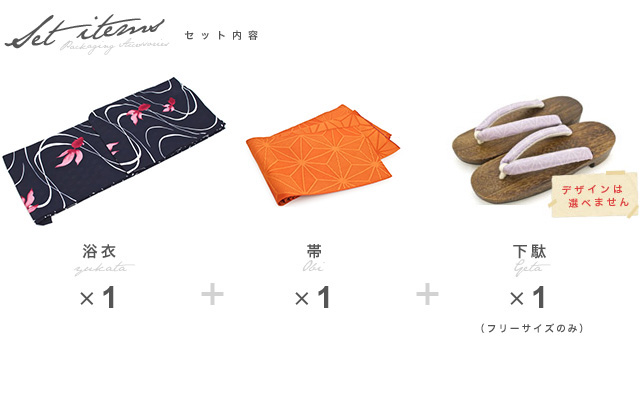こちらの商品は、浴衣・帯・下駄の3点セットです。セット内容の一部変更や、それに伴う値引きは承っておりません。