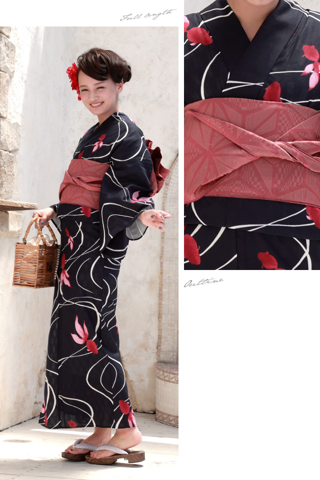 浴衣セット レディース レトロ 浴衣セット 大人 3点セット 紺系 ネイビー 赤 金魚 流水紋 綿 兵児帯 女性 ボヌールセゾン