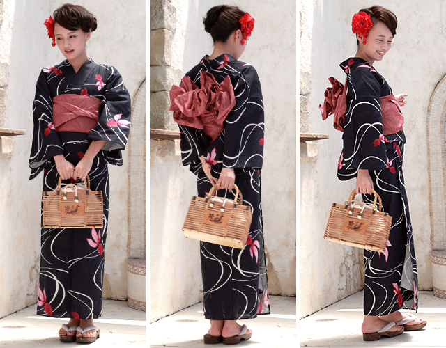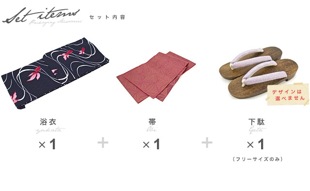 こちらの商品は、浴衣・帯・下駄の3点セットです。セット内容の一部変更や、それに伴う値引きは承っておりません。