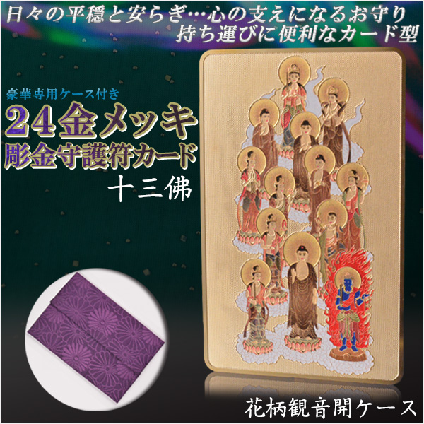 【豪華専用ケース付き:24金メッキ彫金守護符カード 十三佛 花柄観音開きケース】仏具 守護符 本尊 ネコポス送料無料