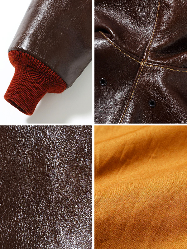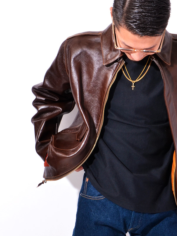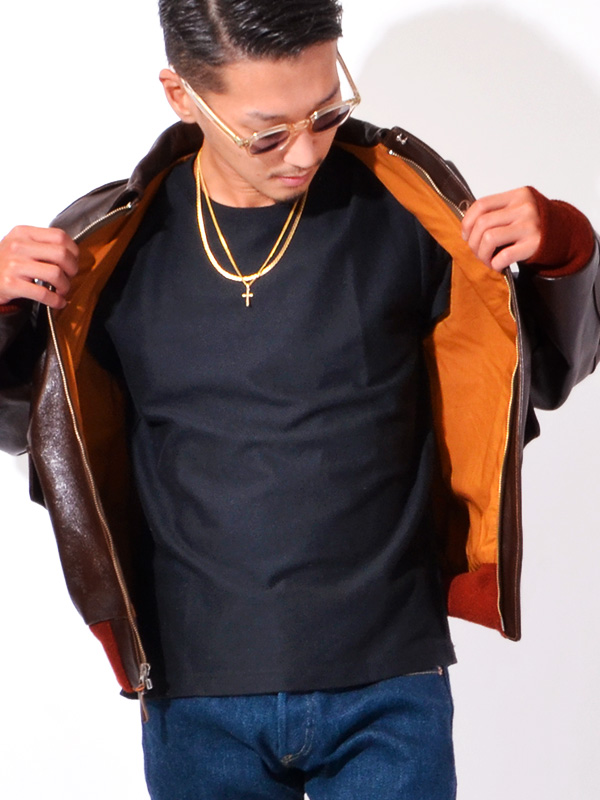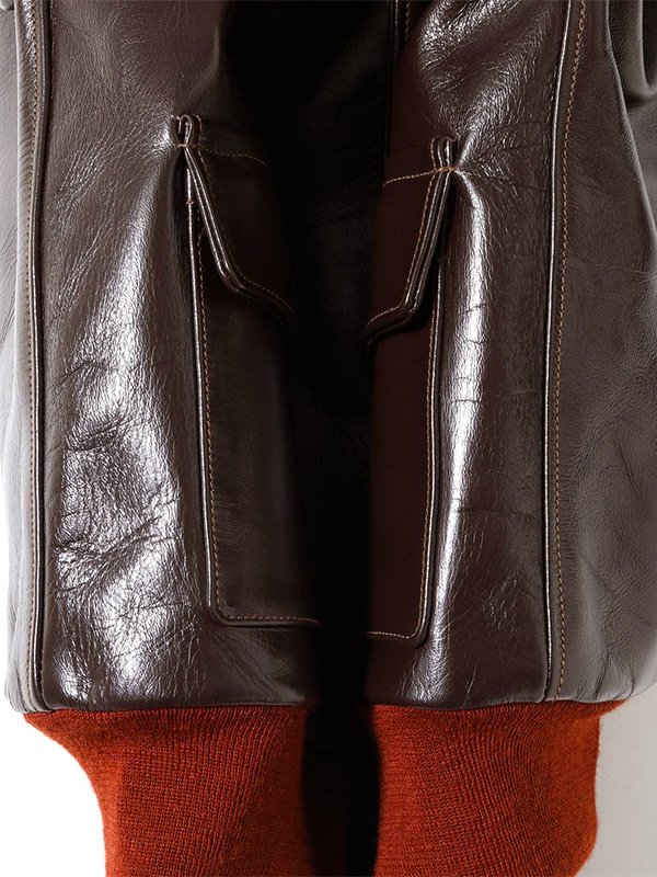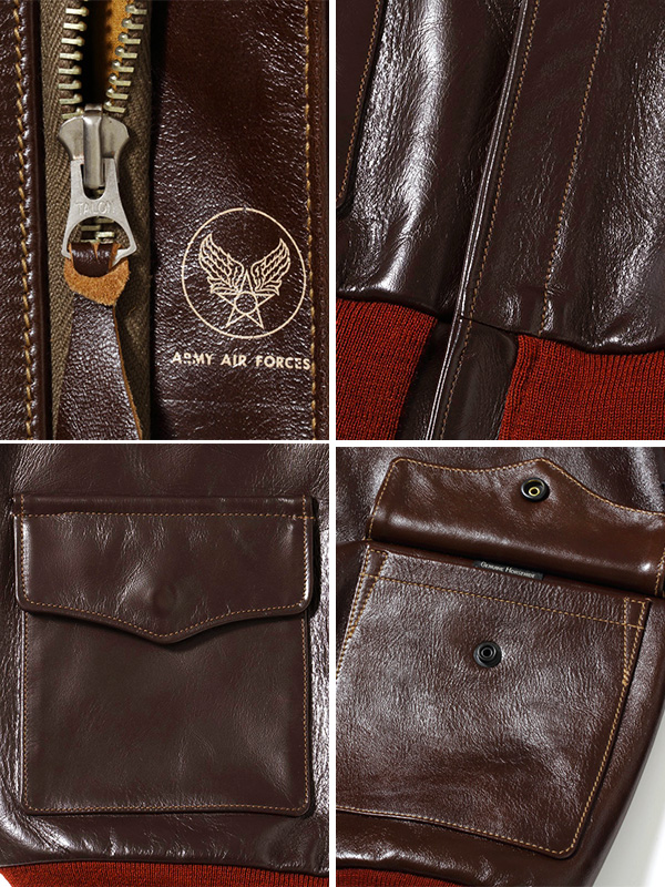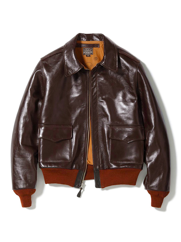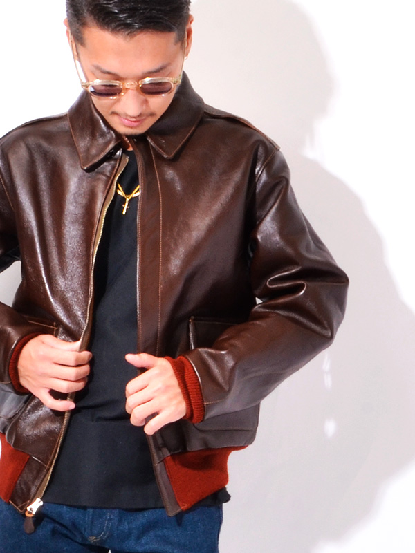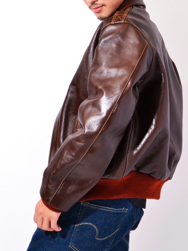 身頃の濃いシールブラウンと赤いリブニットのコントラストが美しいA-2はエアロレザー社を象徴するものである。