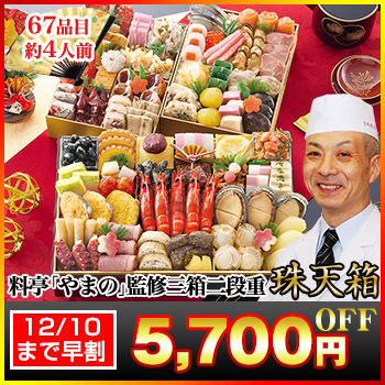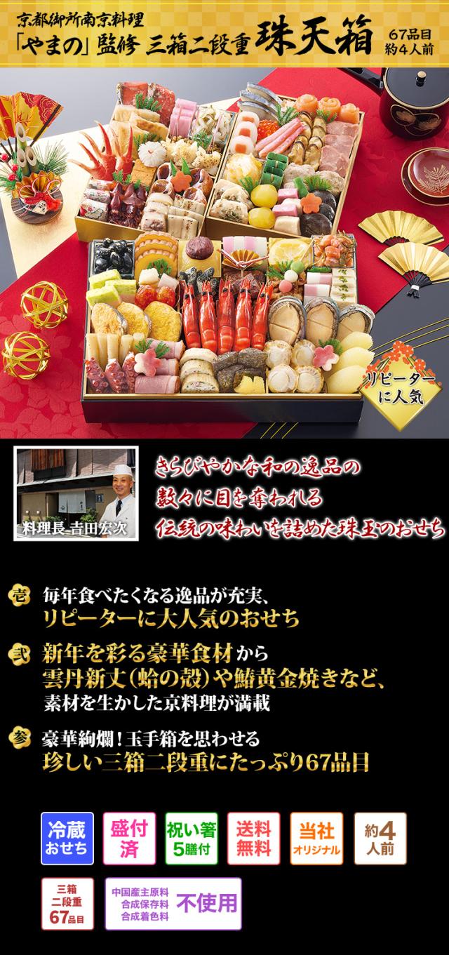 長方形変形三段和風おせち 【67品目・4人前】 京都御所南 京料理「やまの」監修三箱二段重 珠天箱 【送料無料】 冷蔵おせち 冷蔵 おせち お節 御節