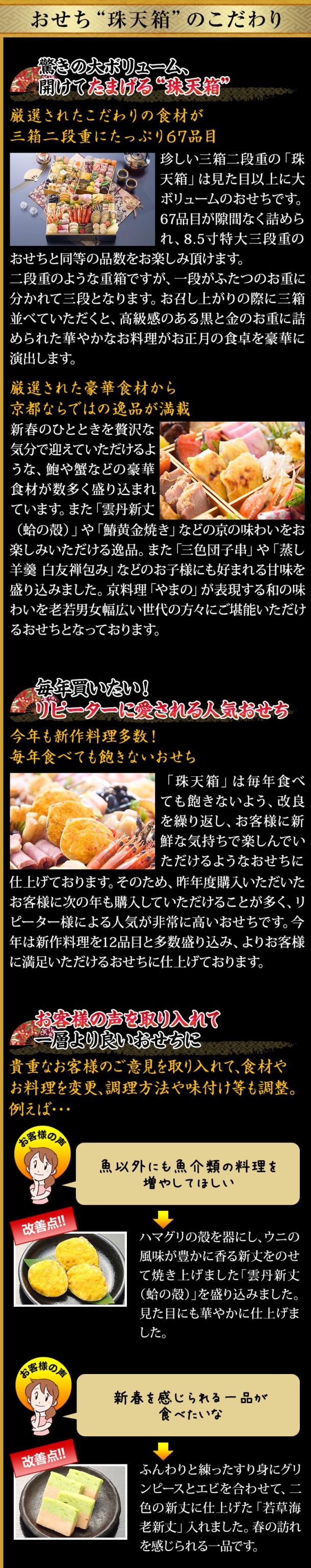 2026年の珠天箱は大満足の67品目。小さめのお重ふたつと、大きいお重という珍しい構成のおせちに京の風情あふれる伝統料理を詰め込みました。小ぶりなお重に見えますが、8.5寸特大三段重おせち並みの品数の豪華料理をお楽しみいただけます。新年を彩るにふさわしい、海老や鮑などの豪華食材から、雲丹新丈や紅鮭砧巻きなどの素材を最大限に生かした伝統料理を盛り込み。世代を超えた多くの方々に満足していただけるおせちに仕上りました。