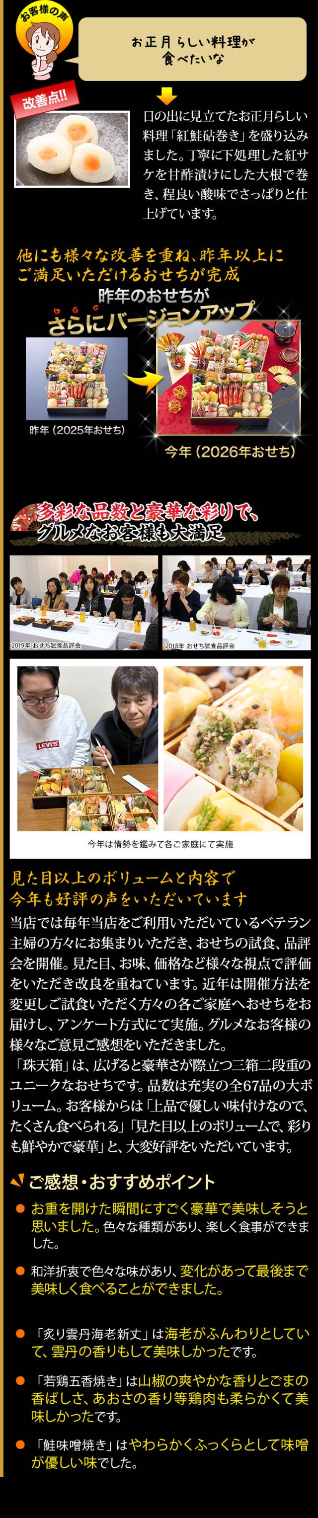 - 毎年「おせち」に悩みますが、こちらのは種類も豊富、お味も(正直あまり期待していなかったせいもあって)美味しかったです 早期割引でとてもお得感あり!