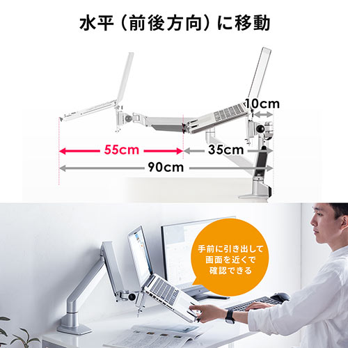 ⇒ご購入の前にご確認下さい水平空間に対して大きく伸縮する3関節ノートパソコンアーム。ガスシリンダーでスムーズな高さ調節も可能。ブラケットが取り外し可能で設置が簡単。【WEB限定商品】