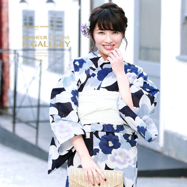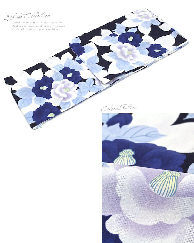 浴衣セット レディース レトロ 浴衣セット 大人 3点セット 紺系 ネイビー 白 椿 つばき 花 綿 兵児帯 女性 ボヌールセゾン