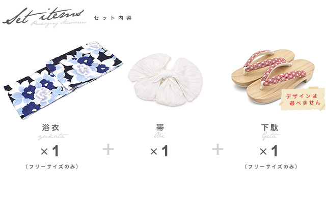 こちらの商品は、浴衣・帯・下駄の3点セットです。セット内容の一部変更や、それに伴う値引きは承っておりません。