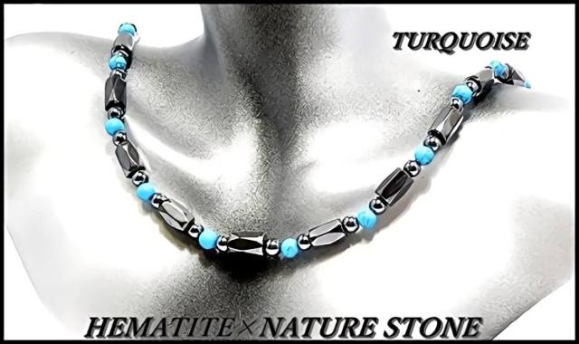 ◆魅惑的な輝きを放つ「ヘマタイト」と、幸運をもたらす「ターコイズ」の、お洒落な天然石磁気入りネックレスです。