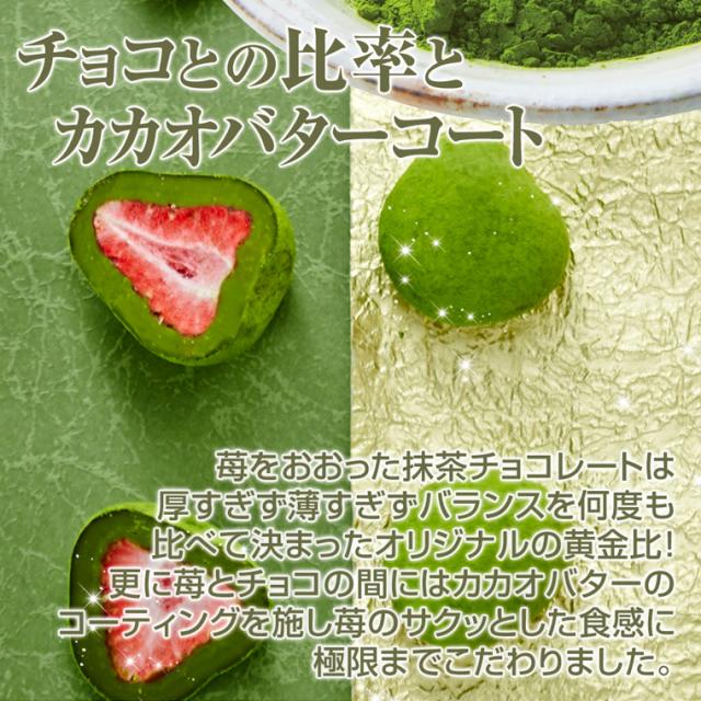 【プレミアムバージョン】大人気のチョコレート"神戸苺トリュフ®"の抹茶バージョンが登場!フリーズドライのサクサク苺を薫り高い抹茶チョコレートでコーティングしました。なめらかなチョコレートに包まれた苺は、フリーズドライならではのサクサクした食感。苺の酸味と、抹茶チョコレートのやさしい甘み、抹茶パウダーのほどよい苦みが口のなかで広がり、和の香りを贅沢に楽しめるよう仕上げました。一口かじれば、茶葉のように深みのある緑に苺の鮮やかな赤が映える、美しいコントラストに出会えます。