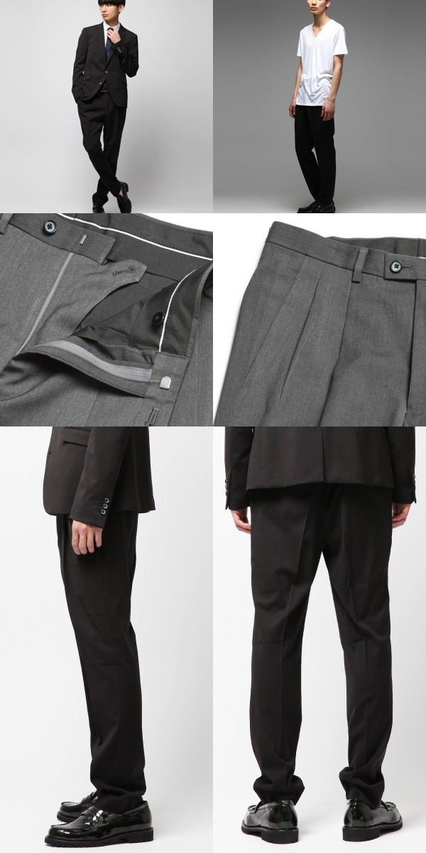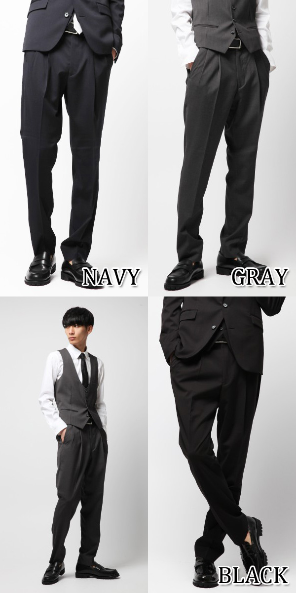ダブルタックが大人な印象を与えるデザイン。同素材を使用したジャケット(BVJ012)と合わせたセットアップコーディネートも可能。
