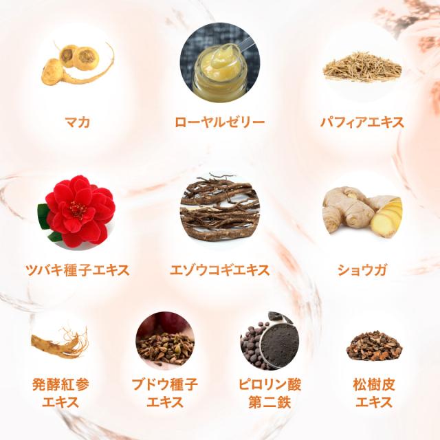 フィッシュコラーゲンペプチド、マカ粉末、ローヤルゼリー末、エゾウコギ粉末、ザクロ果実エキス末、ショウガ粉末、発酵紅参エキス末、ブドウ種子エキス末、松樹皮エキス末、豚プラセンタエキス末、パフィアエキス末、ツバキ種子エキス末、セラミド含有とうもろこし胚芽抽出物、ヒアルロン酸、ピロリン酸第二鉄