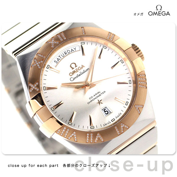 5年保証キャンペーン オメガ コンステレーション コーアクシャル デイデイト 38MM クロノメーター コーアクシャル 自動巻き 123-25-38-22-02-001 OMEGA CONSTELLATION CO-AXIAL DAY-DATE 38MM メンズ 腕時計 アナログ シルバー×レッドゴールド オメガは1848年、ルイ・ブランによってスイスにて設立された高級腕時計ブランドです。 コンステレーションコレクションは、6時位置にある星がポイントになっており、“爪”をモチーフにしたスタイルを確立。印象的なダイヤルも特徴です。 立体的なバーインデックスがスタイリッシュなモデル。6時位置には日付表示を、12時位置には曜日表示を搭載しています。ベゼルにはダイヤモンドで象ったローマ数字が輝きます。風防には傷がつきにくいサファイアクリスタルを採用。裏蓋にはスケルトン加工が施されており、自動巻きならではの動きを目でも楽しむことが出来ます。 機械式腕時計