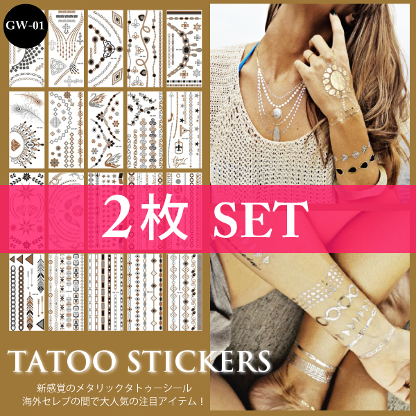【メール便対応】【2枚セット】タトゥーシール メタリックカラー 01 ゴールド シルバー 20種類 【フラッシュタトゥー】 ┃
