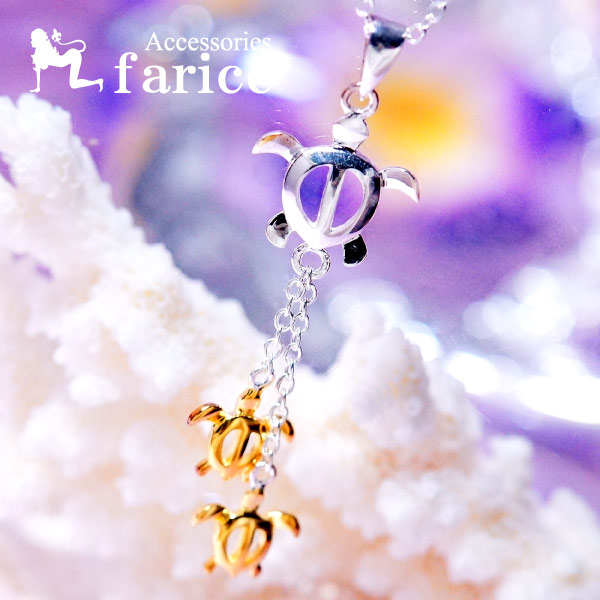 親子3ホヌ(海がめ) あずきチェーンドロップ装飾 イエローゴールドペアカラー ハワイアンジュエリー シルバー925 ネックレス