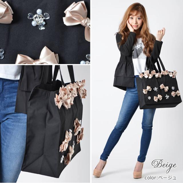 可愛いリボン、ビジュがポイントのリボンビジュトートバッグ。