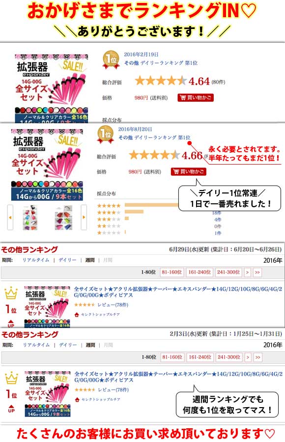 このセットで初めてのボディピアスから00Gまで拡張完了♪