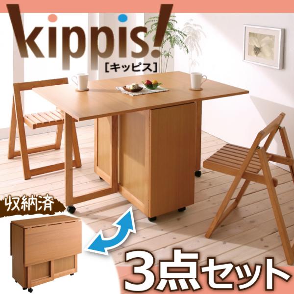 天然木バタフライ伸長式収納ダイニング kippis! キッピス 3点セット(テーブル+チェア2脚) W40-120 折りたたみ